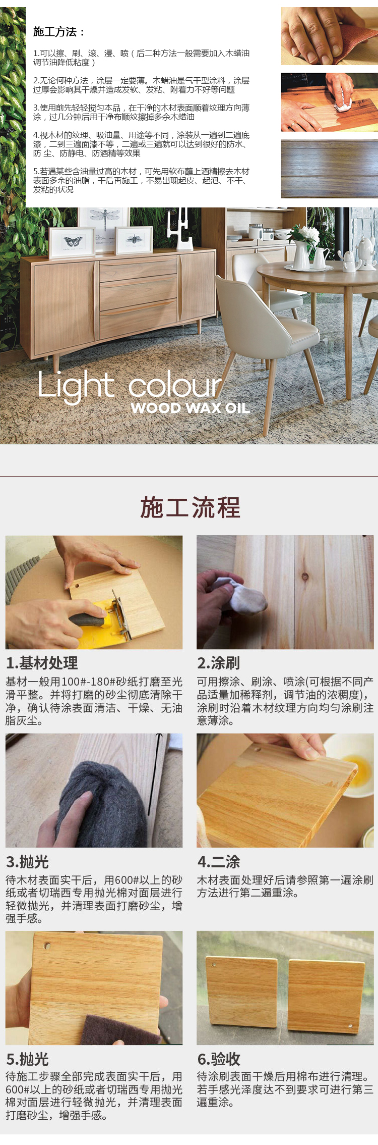 浅色不黄变木蜡油,给木材婴儿般的呵护,突显纹理,尽显木材本色,适用于室内所有木器制品,可根据客户需求与全新风其他类型产品搭配使用,达到最理想的半开放效果。